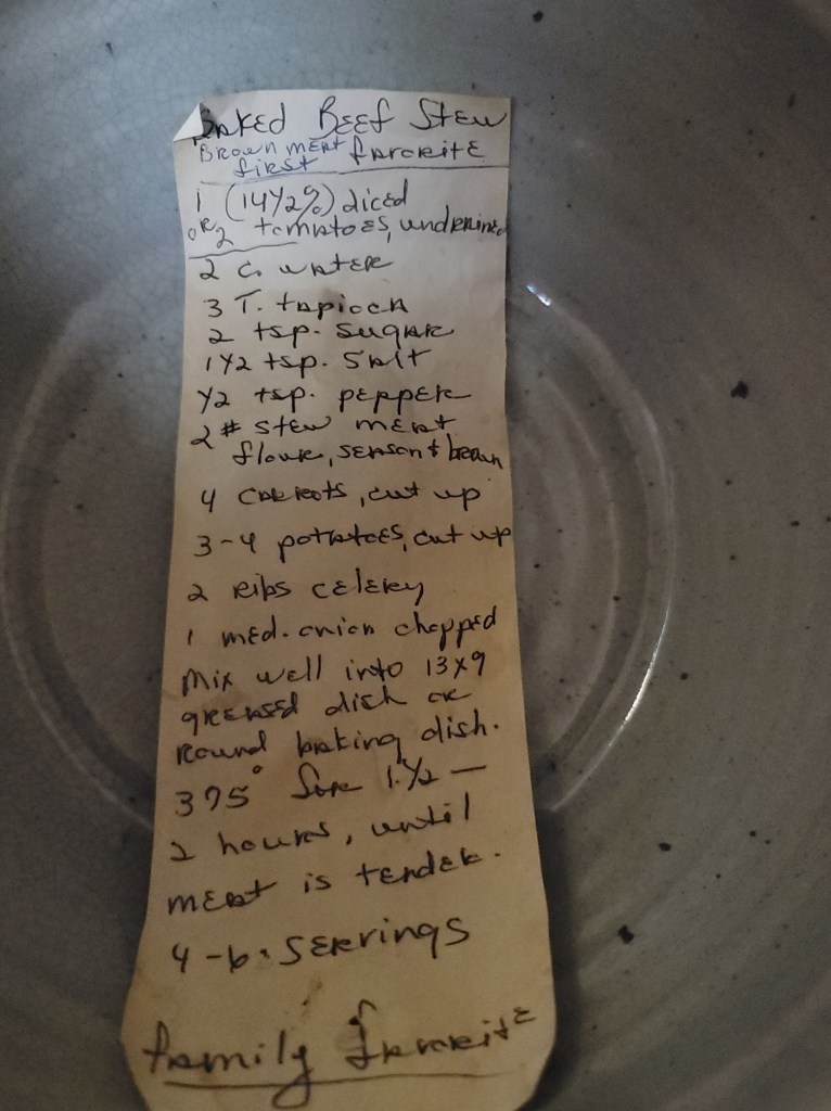 What possessed us to take the lid off and look inside that baking dish, I don’t know. But I’m glad we did, because there was the stew recipe in all its glory – with the notation, “family favorite.”